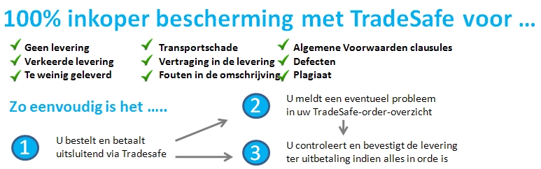 De betaalpagina wordt beheerd door een grote betrouwbare Europese betaalpartner Skrill. Houdt u er rekening mee dat uw betalingen zo snel mogelijk en uitsluitend aan TradeSafe worden gedaan, dit om uw levering en uw 100% inkoopbescherming te kunnen garanderen. Vermeld aub bij uw betaling het unieke TS transactienummer.