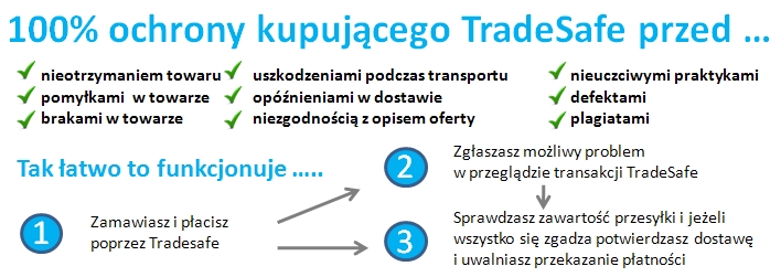 Po złożeniu zamówienia na ofertę, krok ten zostaje potwierdzony dodatkowym eMailem. W eMailu tym znajduje się cała dokumentacja zamówienia w formacie .PDF oraz link przekierowujący do płatności na stronie TradeSafe. Dopiero po dokonaniu przez kupującego płatności na konto TradeSafe, sprzedawca otrzymuje ostateczne zlecenie nadania towaru do wysyłki.
